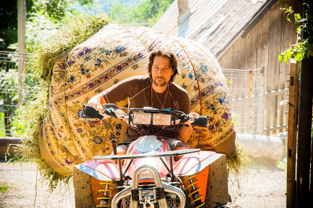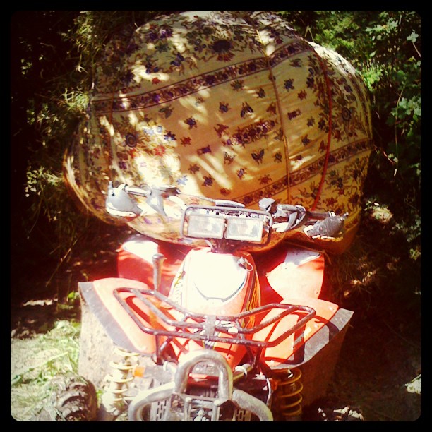 Puisque j’étais « de sortie », la maman d’Elena m’a demandé si c’était possible de transporter du foin, emballé dans un tissu sur mon quad. Cela me semblait évident que oui. Cela fut nettement moins évident quand j’ai vu la taille du tissu et le volume du foin, des cubes allant jusqu’à 1m60 sur 1m60 sur 1m60 ! La moitié de la botte pendait dans le vide ; c’était assez rock’n roll dans les petits chemins de montagne, avec une très mauvaise adhérence.